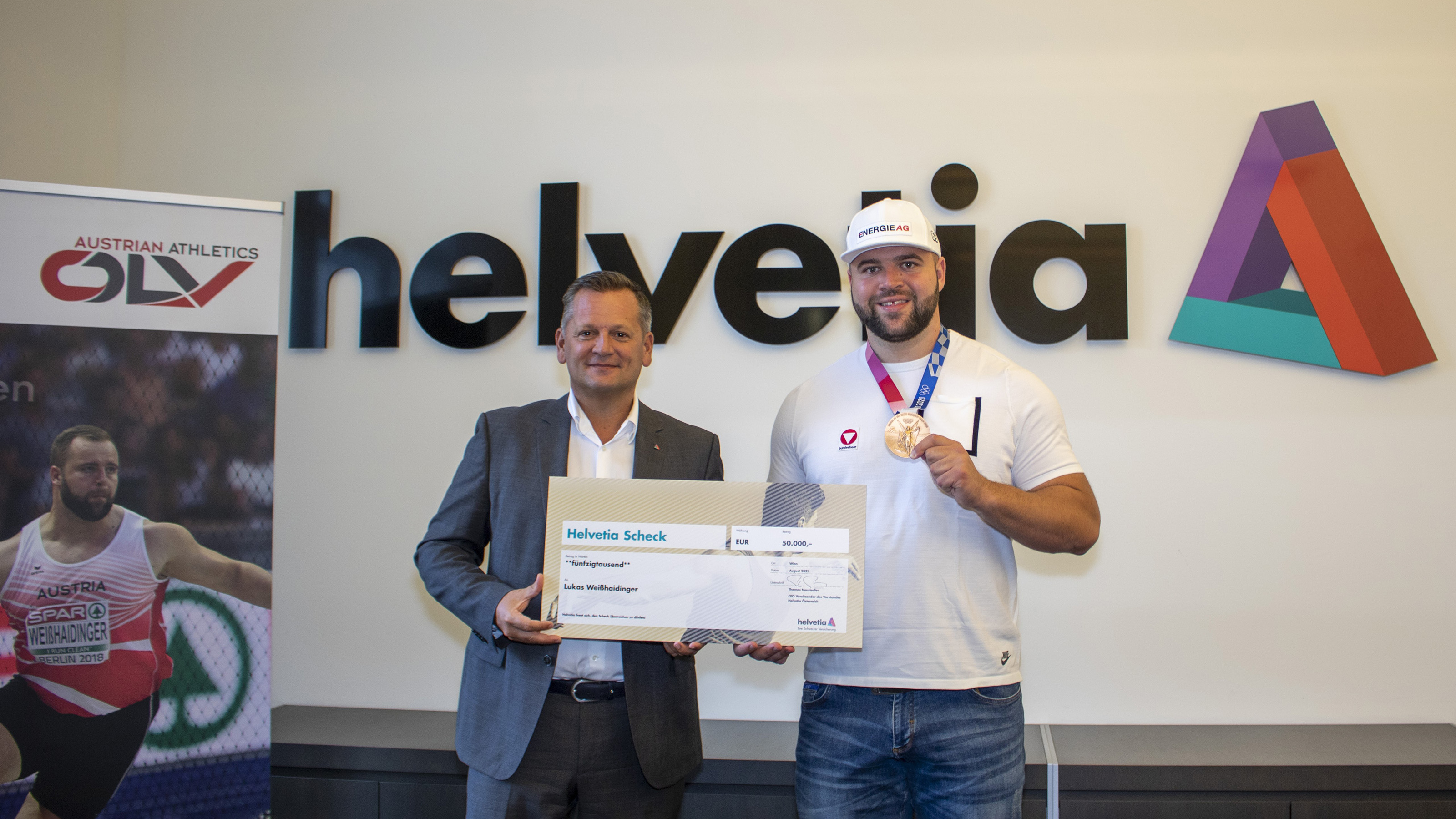 Die Versicherung hatte im Rahmen einer Exklusivpartnerschaft mit dem Österreichischen Leichtathletik-Verband die Kosten für die neu eingeführten Siegprämien in Form einer Versicherungslösung im Erfolgsfall übernommen. Mit insgesamt 75.000 Euro an Siegesprämien konnte Helvetia die bisherigen Diskus-Erfolge des Schärdingers Lukas Weißhaidinger bereits honorieren. Für den WM-Stockerlplatz 2019 hatte Helvetia «Lucky Luki» bereits einen Scheck über 25.000 Euro übergeben. »Als absolut sportbegeistertes Unternehmen haben wir uns wahnsinnig gefreut, dass Lukas nach dem dritten Platz in Doha 2019 jetzt auch in Tokio seinen Medaillentraum mit spektakulären 67,07 Metern erfüllen konnte und wieder Bronze mit nach Hause gebracht hat«, so Thomas Neusiedler, CEO bei Helvetia Österreich, im Rahmen der heutigen Pressekonferenz des Österreichischem Leichtathletik-Verbandes in der Helvetia Generaldirektion zur Vorschau auf das Diamond-League-Finale.