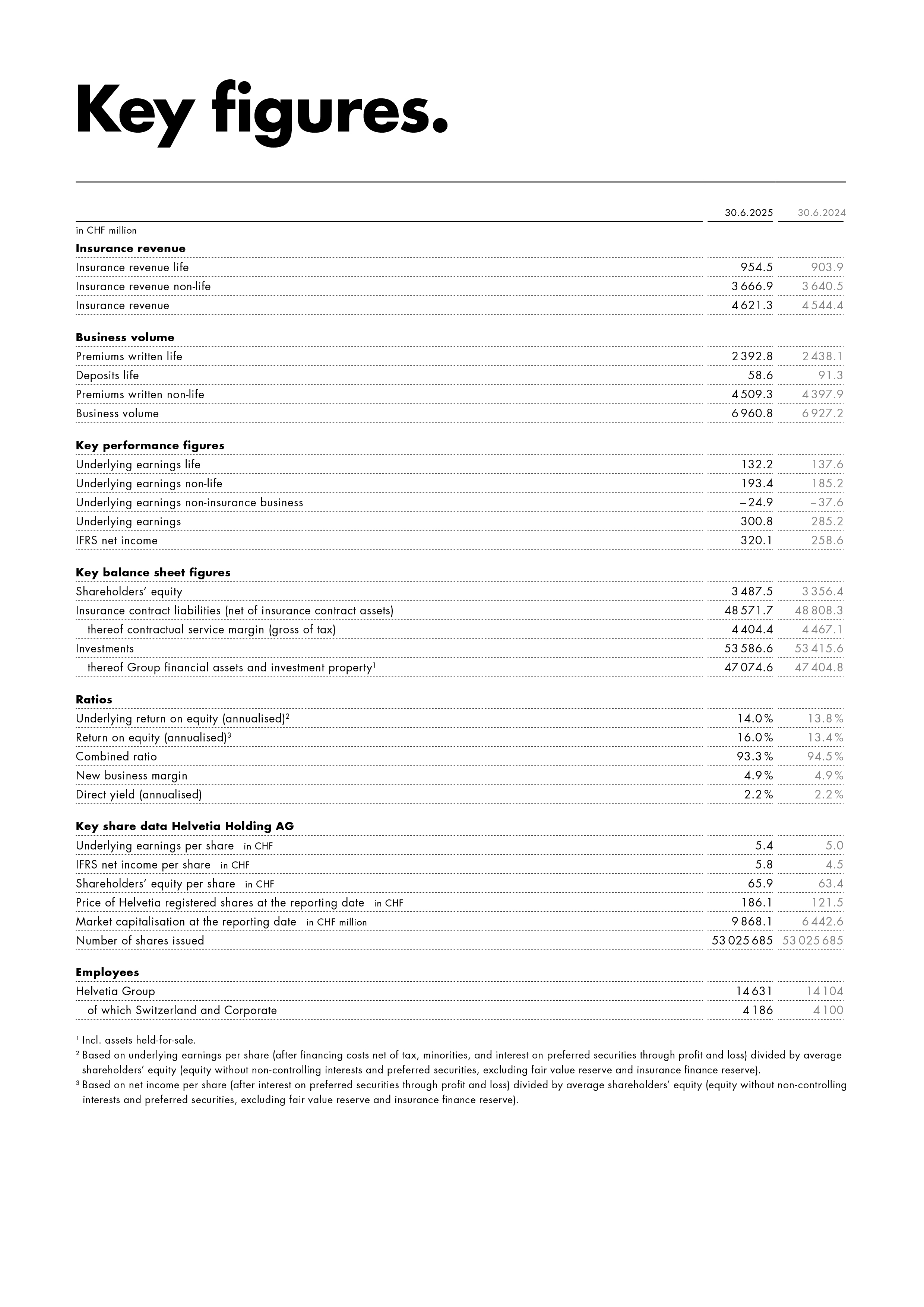 In the first half of 2025, Helvetia continued to perform strongly and demonstrated the strength of its diversified business portfolio. Key figures of the 2025 half-year financial statements: - Underlying earnings grew 5.5% in the first half of 2025 to CHF 300.8 million (first half of 2024: CHF 285.2 million).
